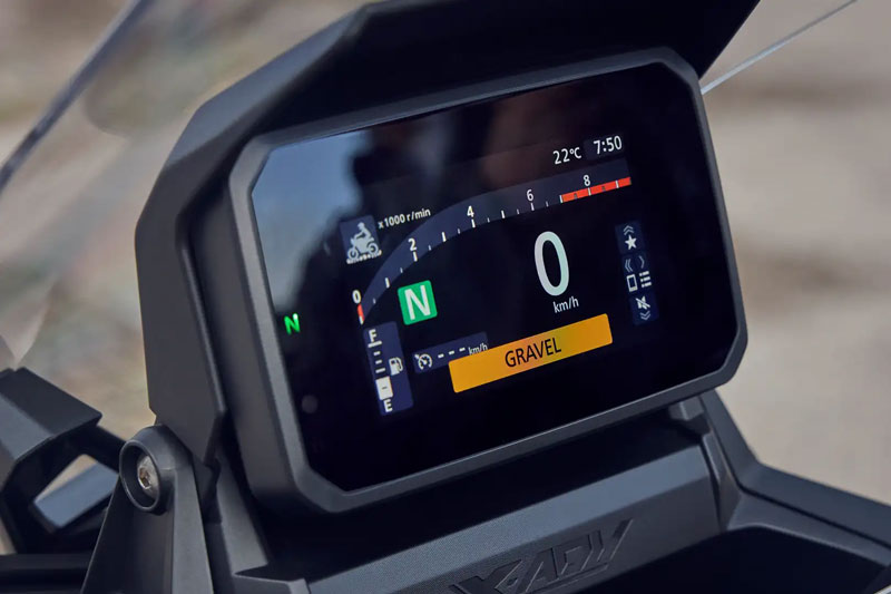 Hệ thống đèn Daytime Running Light (DRL) của X-ADV 750 2025 đã được nâng cấp, giờ đây có chức năng như đèn báo rẽ, giúp tăng khả năng nhận diện khi di chuyển. Ngoài ra, Honda còn áp dụng công nghệ "mắt ẩn", làm tối khu vực xung quanh ống kính máy chiếu, giúp đèn DRL nổi bật hơn khi bật.Bảng đồng hồ TFT 5 inch cũng được nâng cấp, cải thiện khả năng hiển thị dưới ánh sáng mặt trời. Người dùng có thể tùy chỉnh giao diện theo 3 phong cách hiển thị gồm thanh (Bar Style), hình tròn (Round Style) và đơn giản (Simple Style).